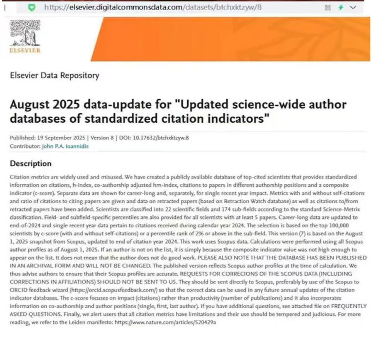 9月20日,美国斯坦福大学(Stanford University)与国际权威学术出版社爱思唯尔旗下的数据库(Elsevier Data Repository)联合发布了2025年度第八版《全球前2%顶尖科学家榜单》(World’s Top 2% Scientists)。DB中国旗舰官方网站马超美教授凭借深厚的理论积淀与卓越的研究产出成功入选 “生涯科学影响力” 和 “年度科学影响力” 榜单。